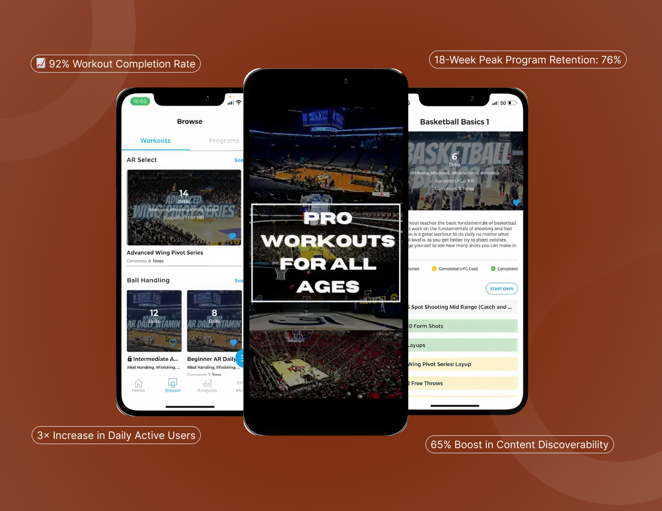 Coach-driven basketball training platform with iPad-based AR solution, improving off-court practice consistency by 50-60%.